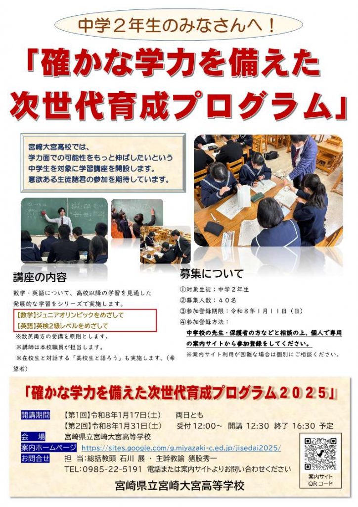 宮崎大宮高校では、自分の可能性をもっと伸ばしたいという中学生を対象に、学習講座を開講します。1月17日(土)、1月31日(土)の全2回で、2回とも数学、英語の講座です。数学講座は「ジュニアオリンピックをめざして」、英語講座は「英検2級レベルをめざして」というテーマで実施します。